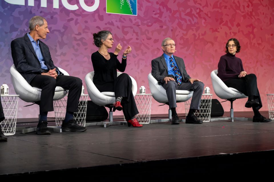 From the left: Thomas Rosenbaum, Dianne Newman, W.E. Moerner and Elissa Hallem sit on a stage at Regeneron ISEF.